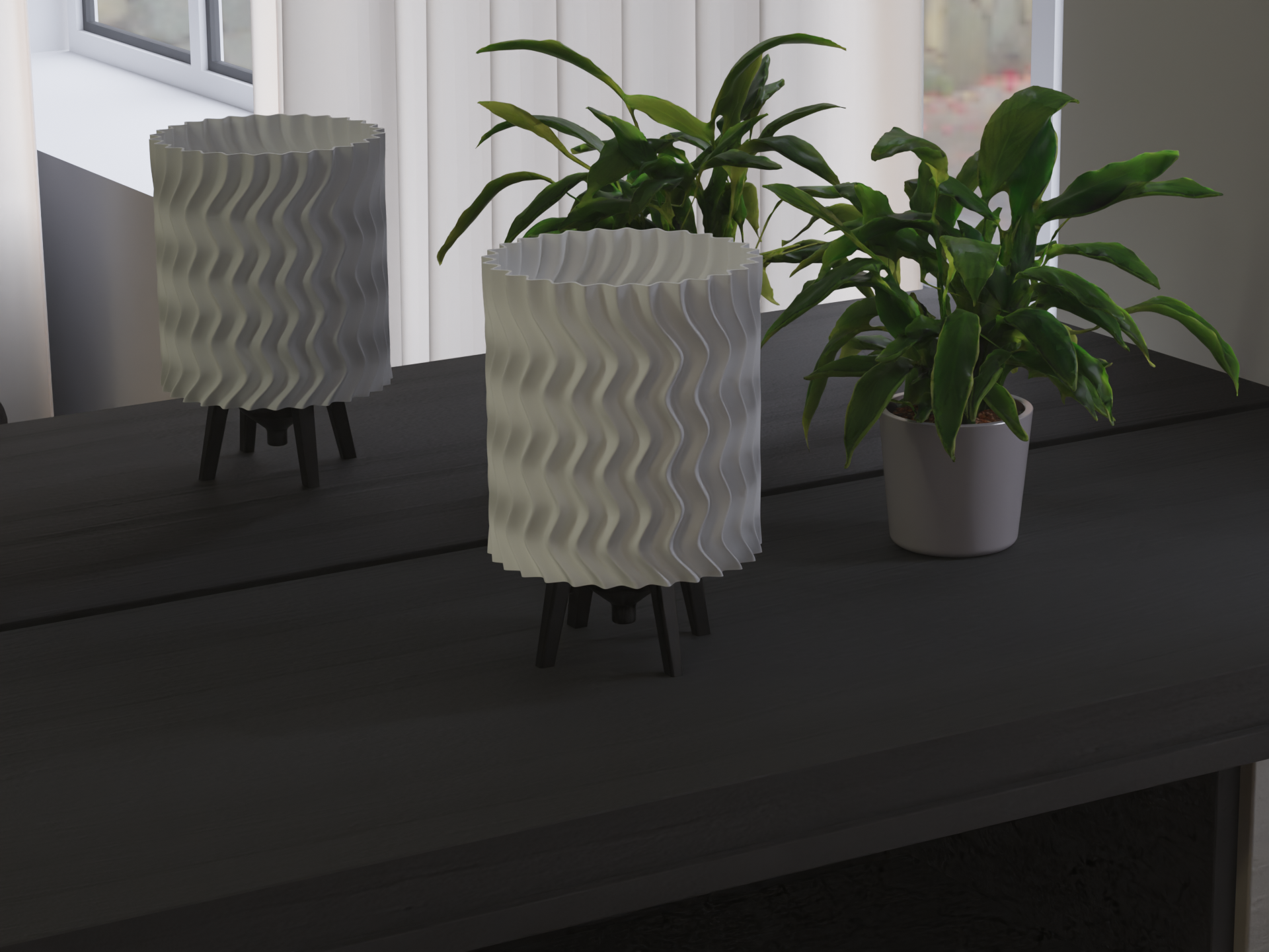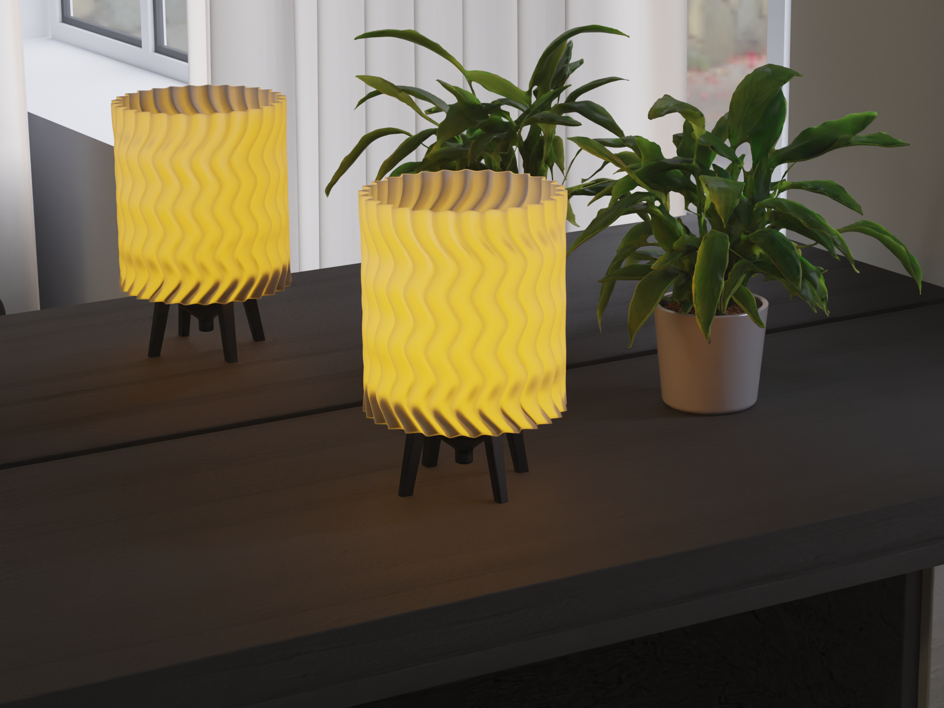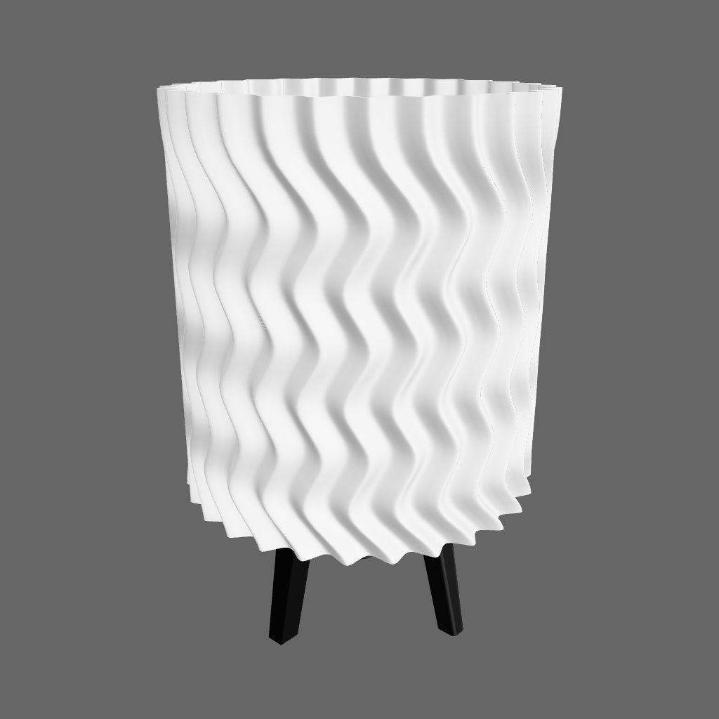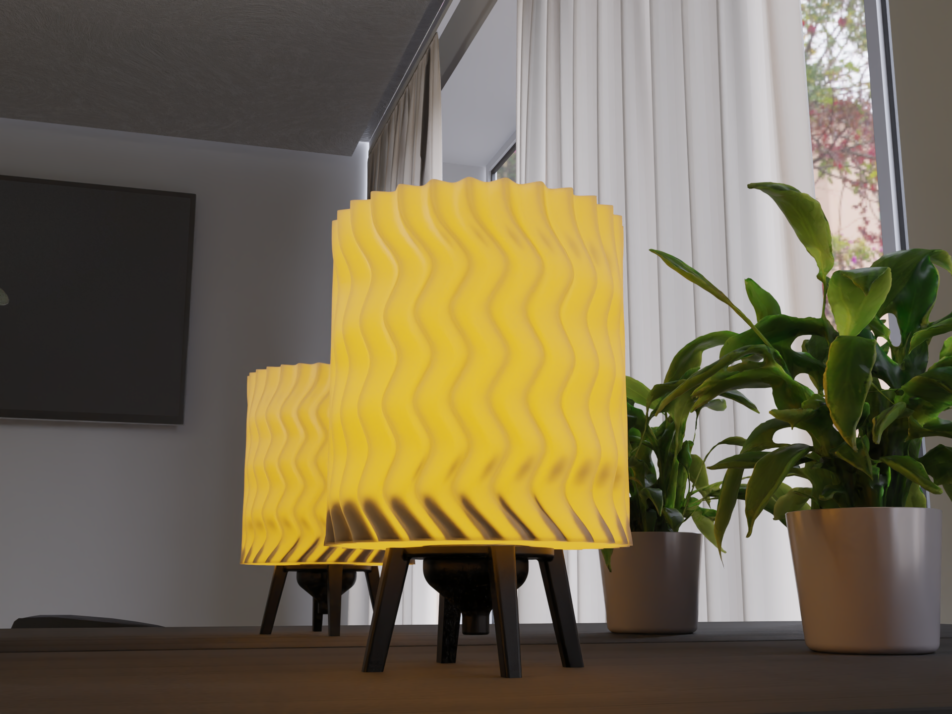 A modern table lamp with a sculpted wave-patterned shade that radiates a warm, golden glow. The flowing surface captures the essence of moving light, giving the lamp a dynamic yet soothing presence. Resting on four sleek black legs, it balances stability with contemporary style — a statement piece that brings both elegance and comfort into any space.